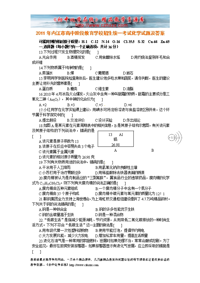2011年内江市高中阶段教育学校招生统一考试化学试题及答案