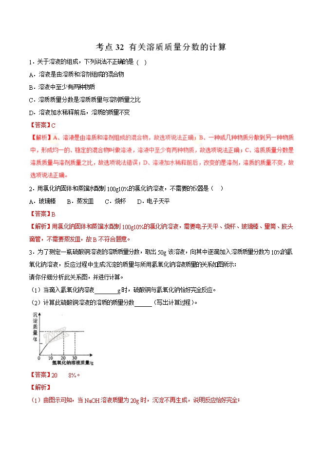 【内容简介】2019年九年级化学中考考点突破考点32 有关溶质质量分数的计算(解析版)