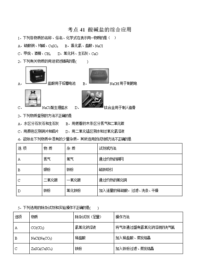 2019年九年级化学中考考点突破考点34 酸碱盐的综合应用(原卷版)