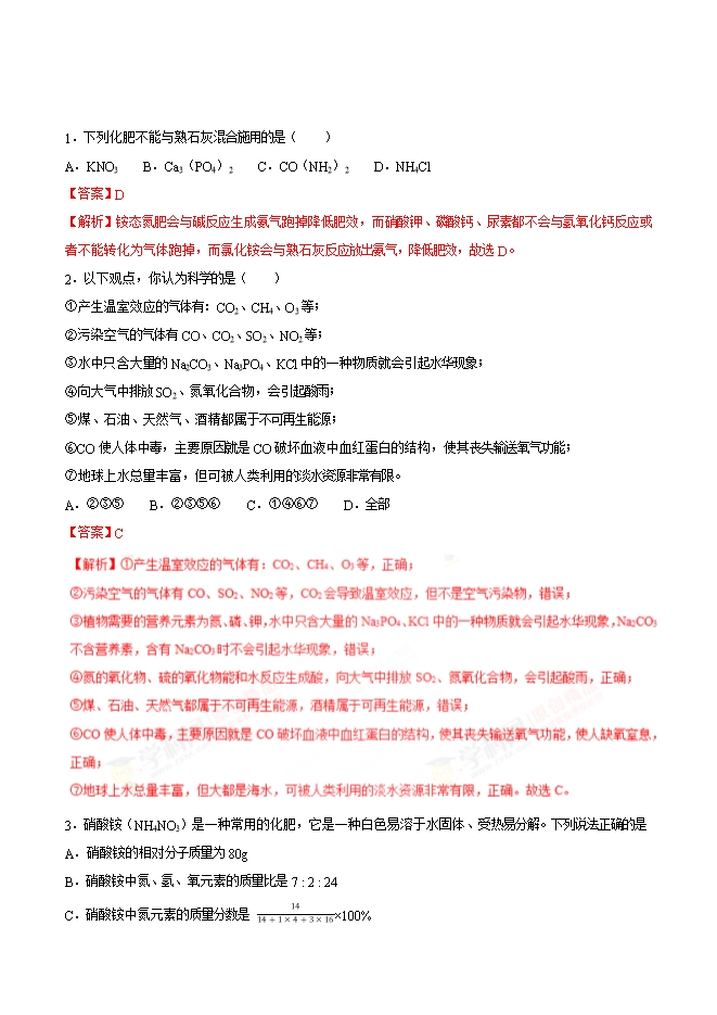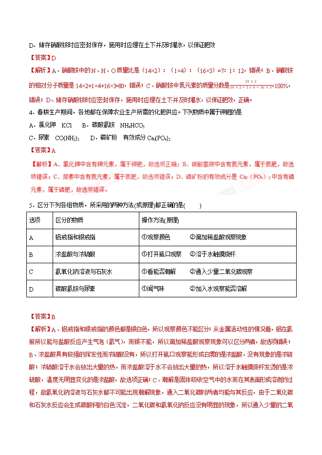 2019年九年级化学中考考点突破考点35 化肥的分类和功效(解析版)