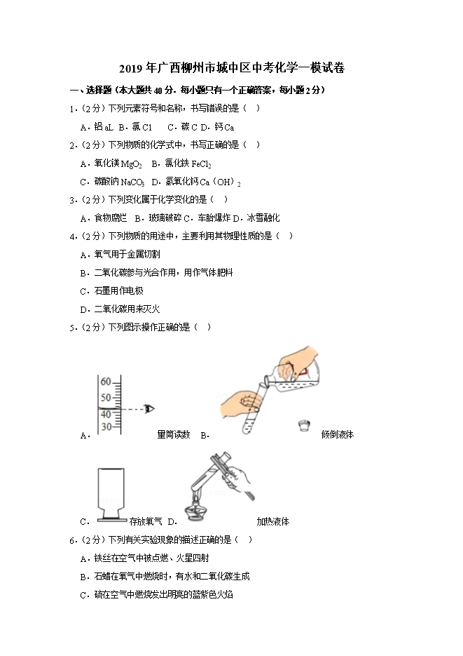 【内容简介】2019年广西柳州市城中区中考化学一模试卷(word版含答案解析)
