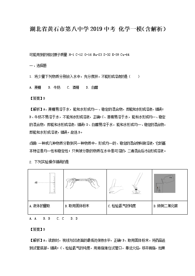 【内容简介】2019年湖北省黄石市第八中学化学一模(word版含答案解析)