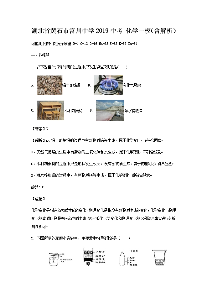 【内容简介】2019年湖北省黄石市富川中学 化学一模(word版含答案解析)