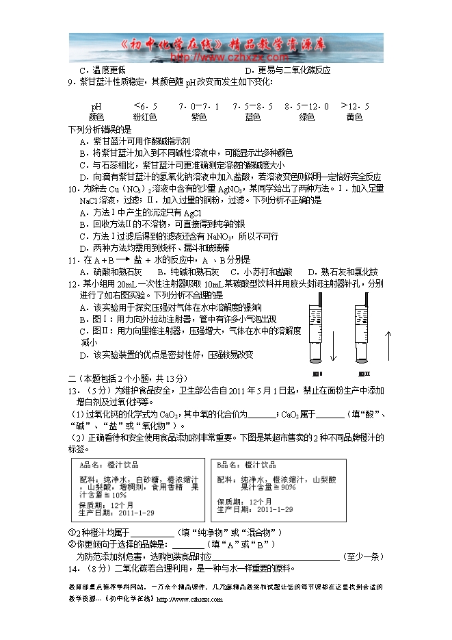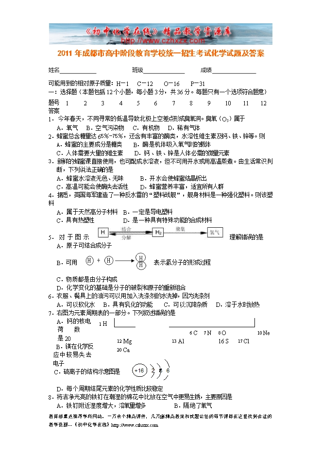 2011年成都市高中阶段教育学校统一招生考试化学试题及答案