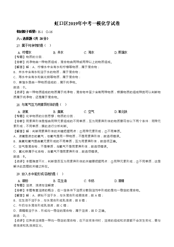 【内容简介】2019年上海市虹口区九年级一模考试化学试题(word版含答案解析)
