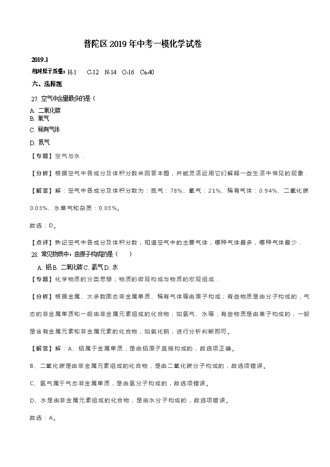 【内容简介】2019年上海市普陀区九年级中考一模化学试题(word版含答案解析)