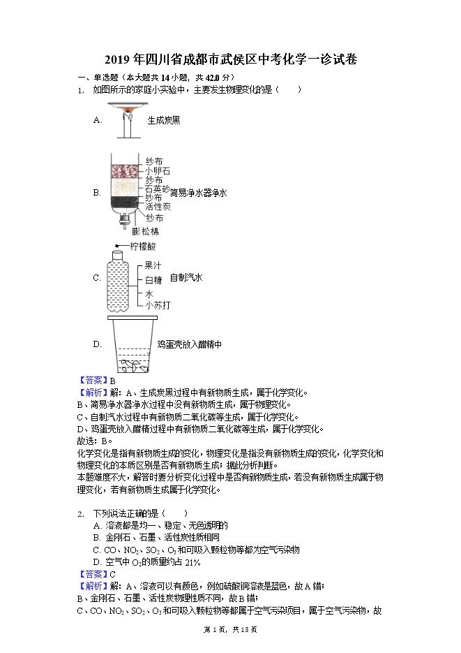 【内容简介】2019年四川省成都市武侯区中考化学一诊试卷(word版含答案解析)
