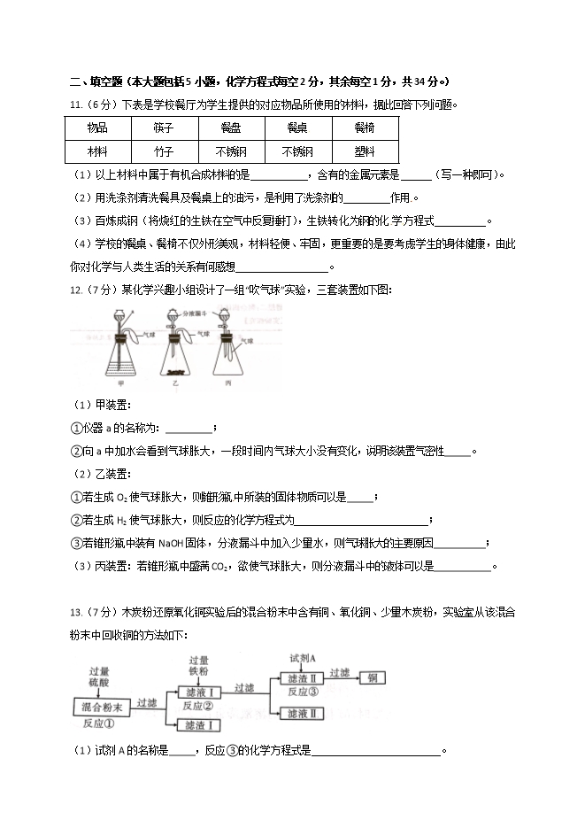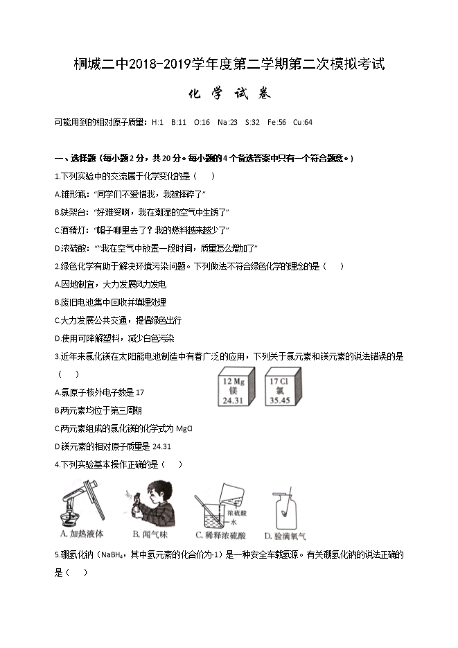 【内容简介】2019届安徽省桐城市第二中学九年级下学期第二次模拟考试化学试题(word版含答案)