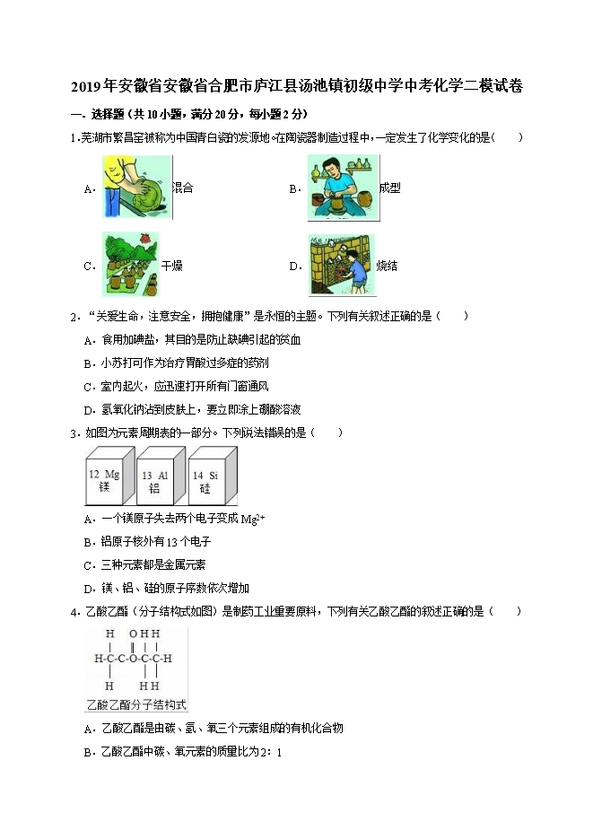 【内容简介】2019年安徽省安徽省合肥市庐江县汤池镇初级中学中考化学二模试卷(word解析版)