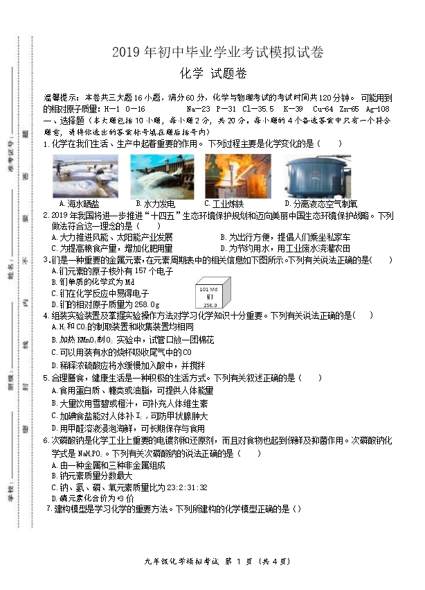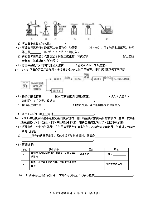 【内容简介】2019年安徽省合肥市瑶海区二模化学试卷(Word版试卷图片答案)