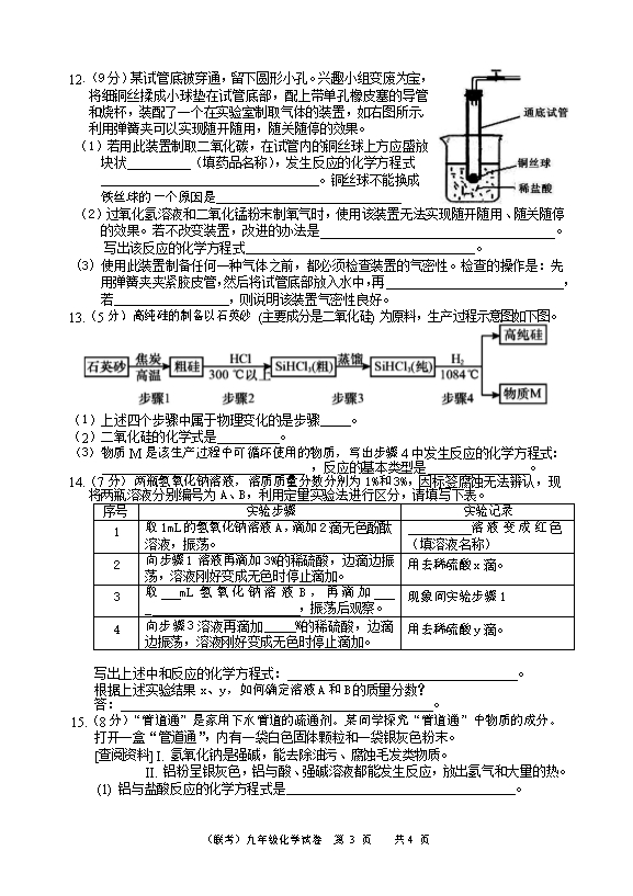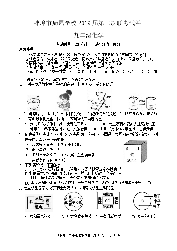 【内容简介】2019年安徽蚌埠市局属学校九年级第二次联考化学试题 (Word版含答案)