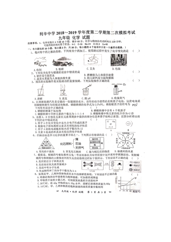 【内容简介】2019年安徽省亳州市利辛中学第二次模拟考试九年级化学试题(图片版试题Word版答案)