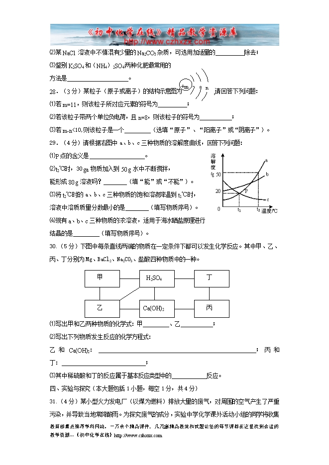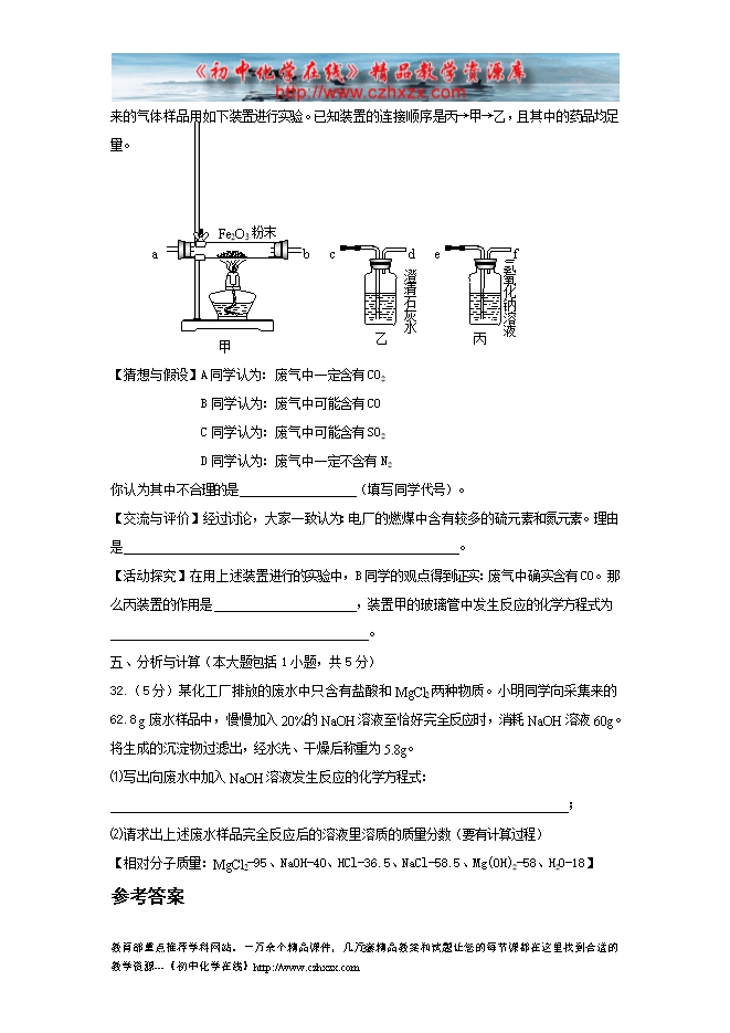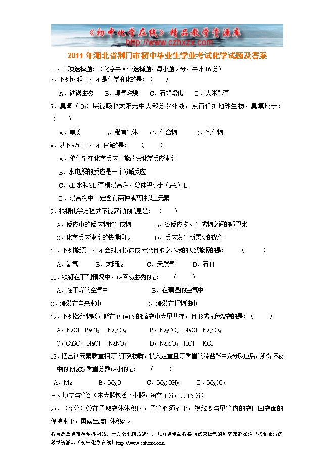 2011年湖北省荆门市初中毕业生学业考试化学试题及答案