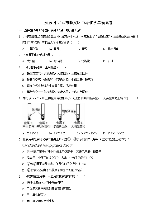 【内容简介】2019年北京市顺义区中考化学二模试卷(word解析版)