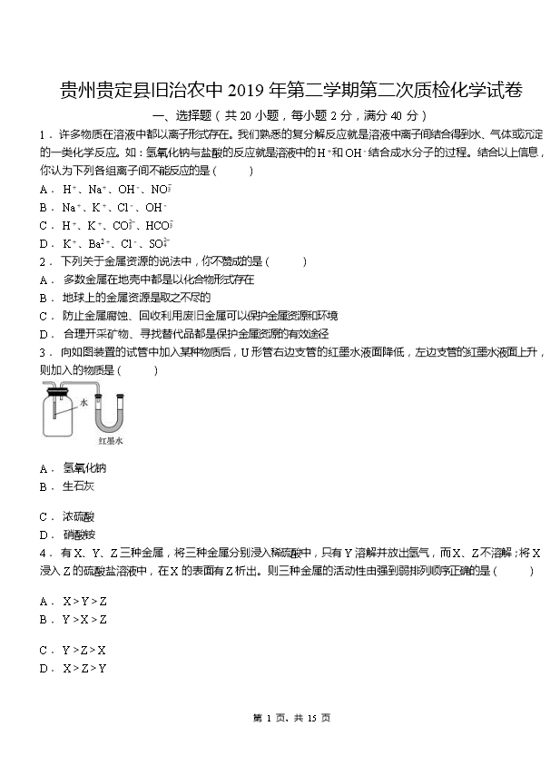 2019年贵州贵定县旧治农中第二学期第二次质检化学试卷(word解析版)