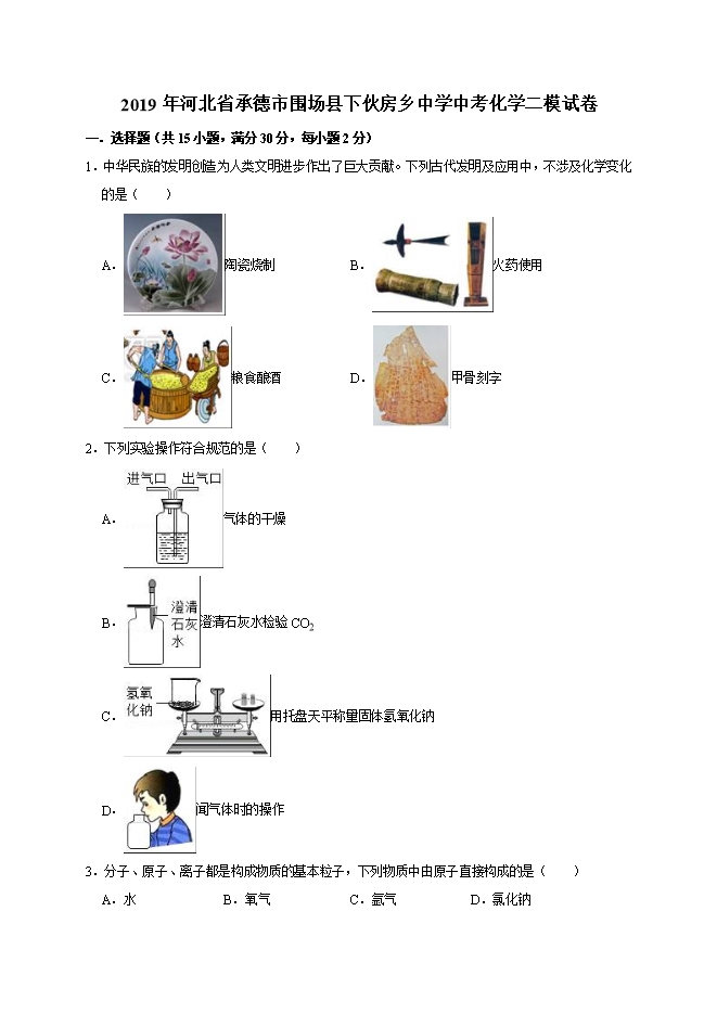 【内容简介】2019年河北省承德市围场县下伙房乡中学中考化学二模试卷(word解析版)