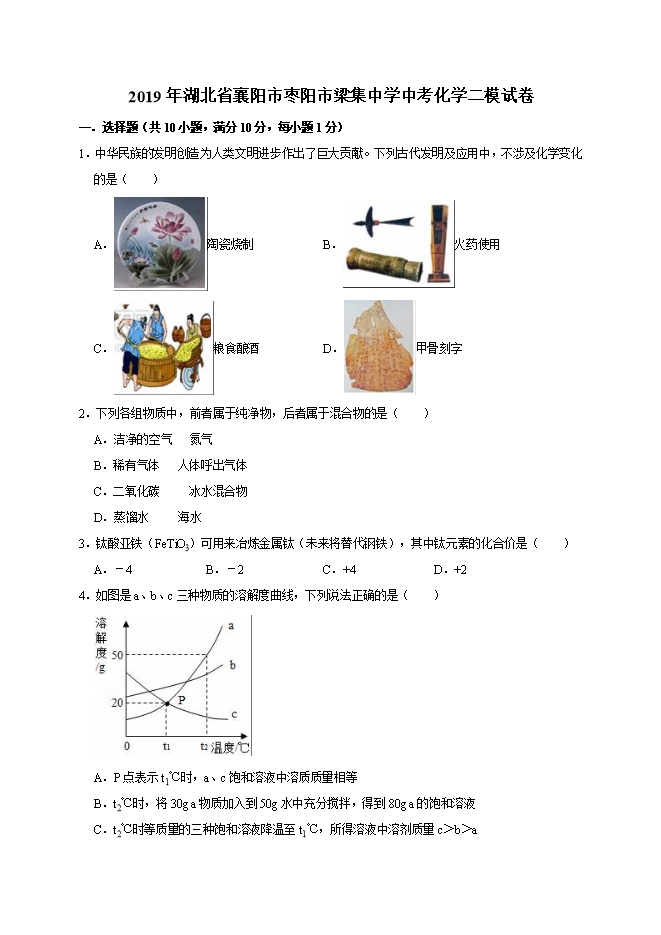 【内容简介】2019年湖北省襄阳市枣阳市梁集中学中考化学二模试卷(word解析版)