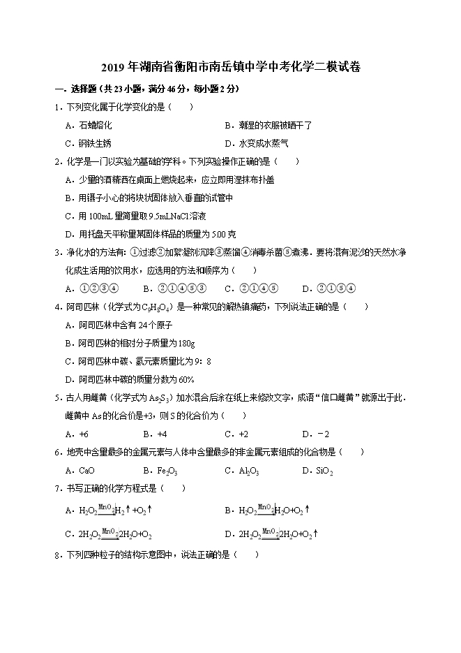 【内容简介】2019年湖南省衡阳市南岳镇中学中考化学二模试卷(word解析版)