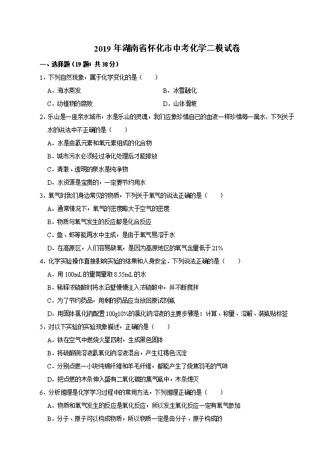 【内容简介】2019年湖南省怀化市中考化学二模试卷(word解析版)