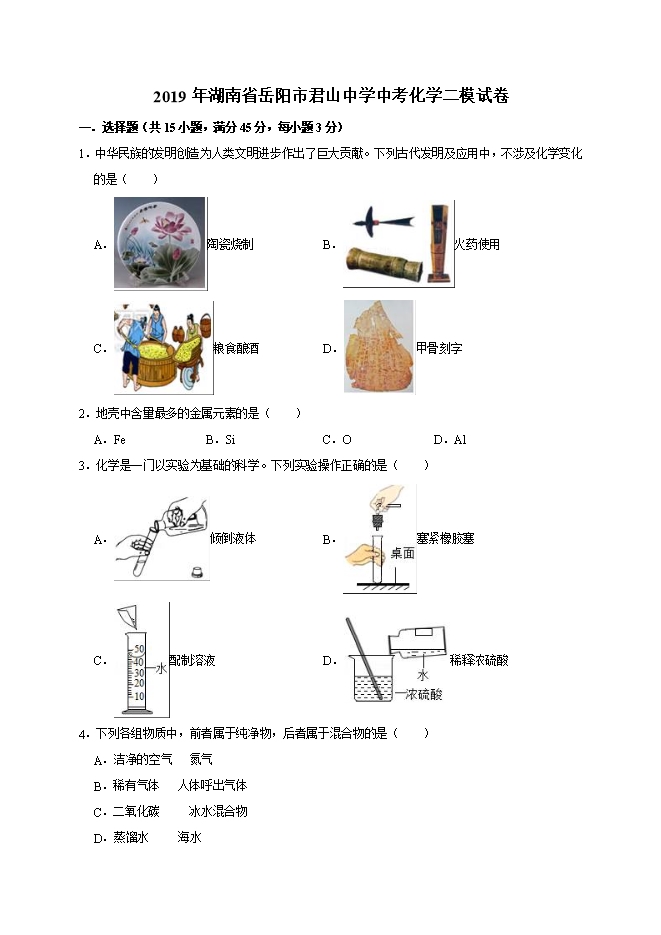 【内容简介】2019年湖南省岳阳市君山中学中考化学二模试卷(word解析版)