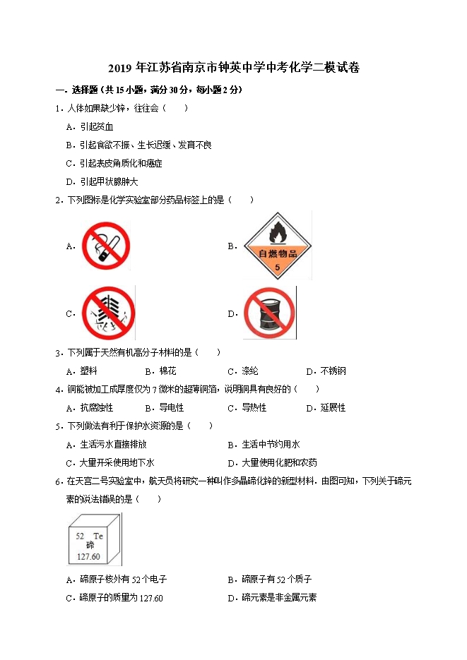 【内容简介】2019年江苏省南京市钟英中学中考化学二模试卷(word解析版)