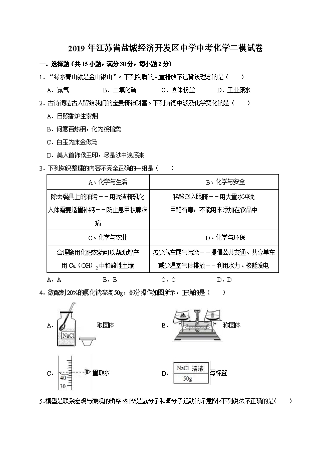 【内容简介】2019年江苏省盐城经济开发区中学中考化学二模试卷(word解析版)