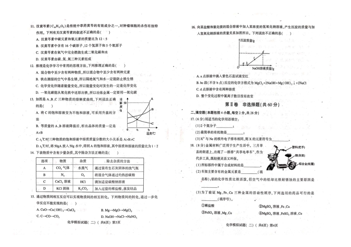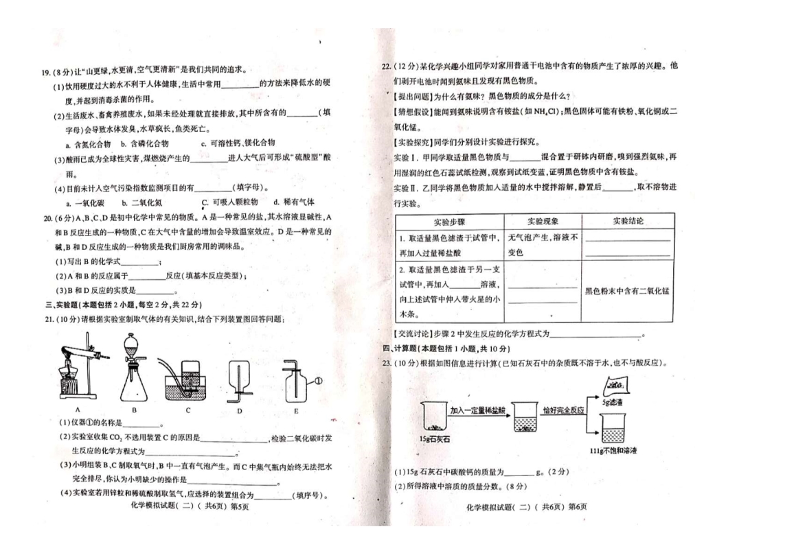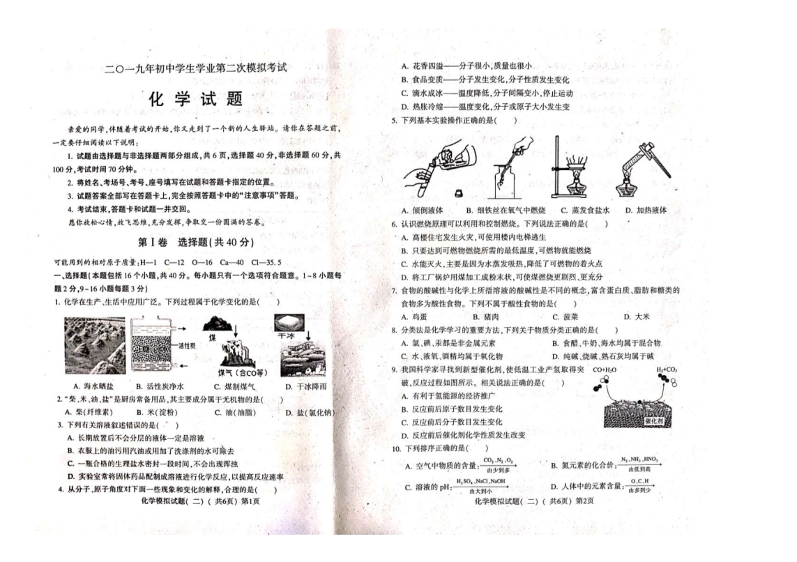 2019年山东聊城开发区九年级第二次模拟化学试题(图片版含答案)