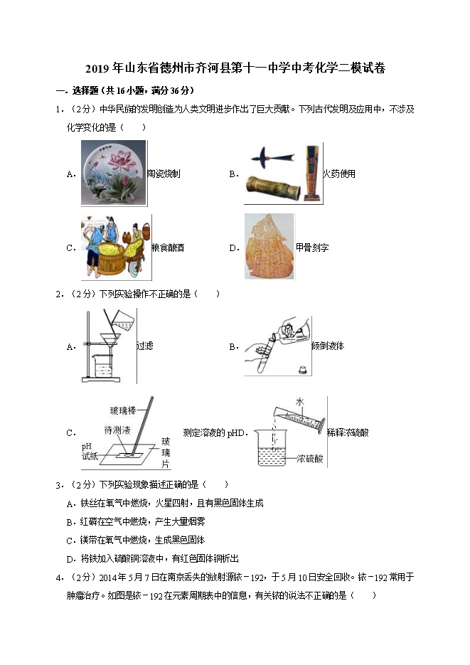 【内容简介】2019年山东省德州市齐河县第十一中学中考化学二模试卷(word解析版)