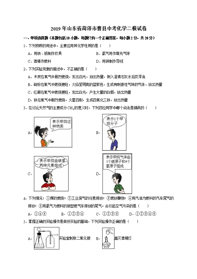【内容简介】2019年山东省菏泽市曹县中考化学二模试卷(word解析版)