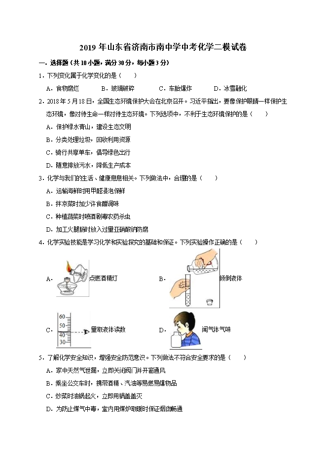 【内容简介】2019年山东省济南市南中学中考化学二模试卷(word解析版)