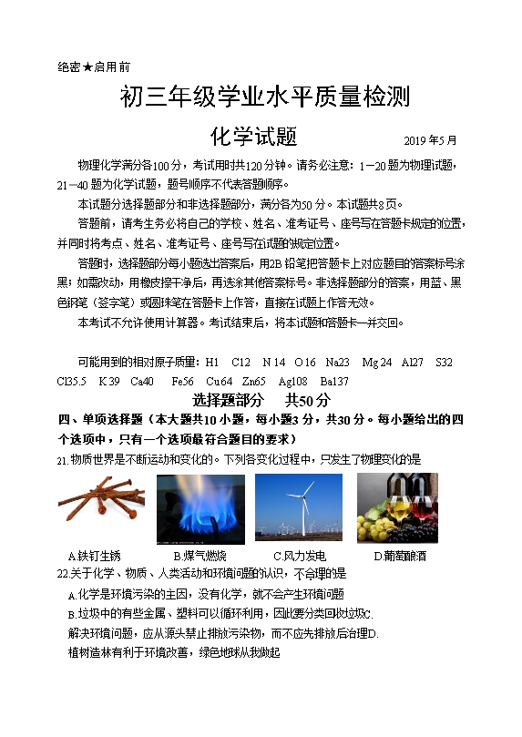 【内容简介】2019年山东省济南市市中区中考化学二模试题(word版含答案)