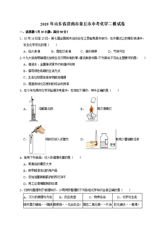 【内容简介】2019年山东省济南市章丘市中考化学二模试卷(word解析版)