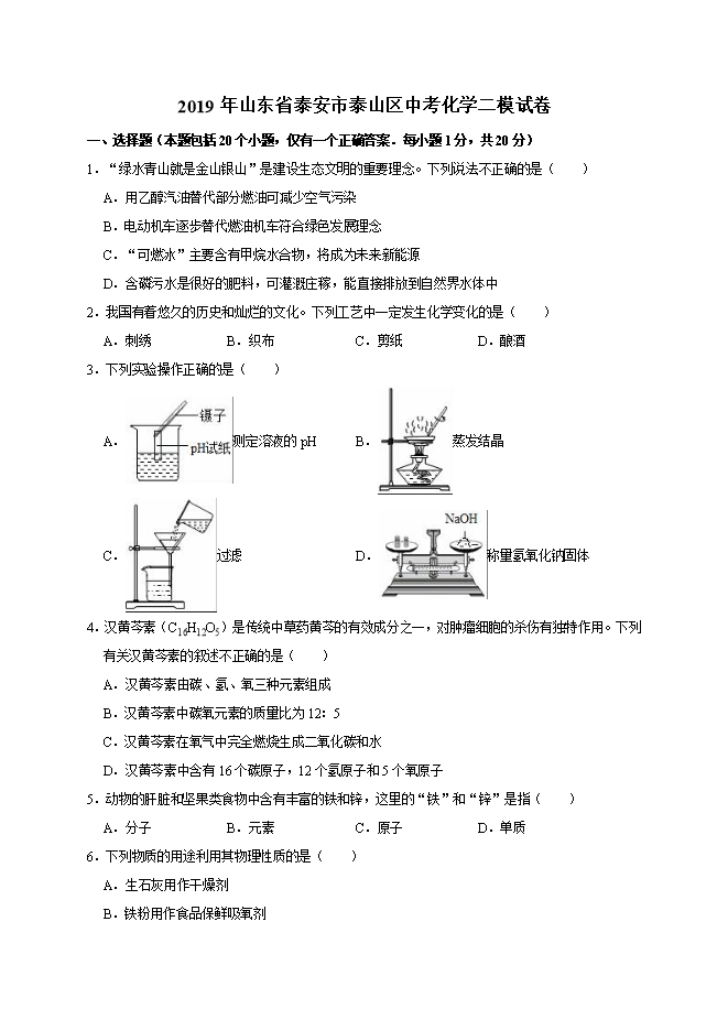 【内容简介】2019年山东省泰安市泰山区中考化学二模试卷(word解析版)