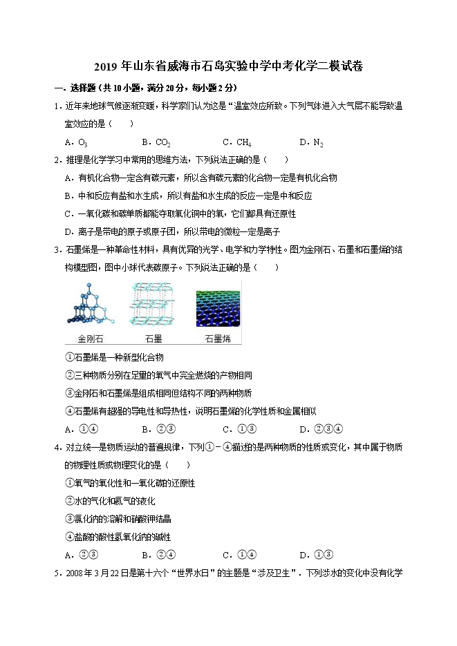 【内容简介】2019年山东省威海市石岛实验中学中考化学二模试卷(word解析版)