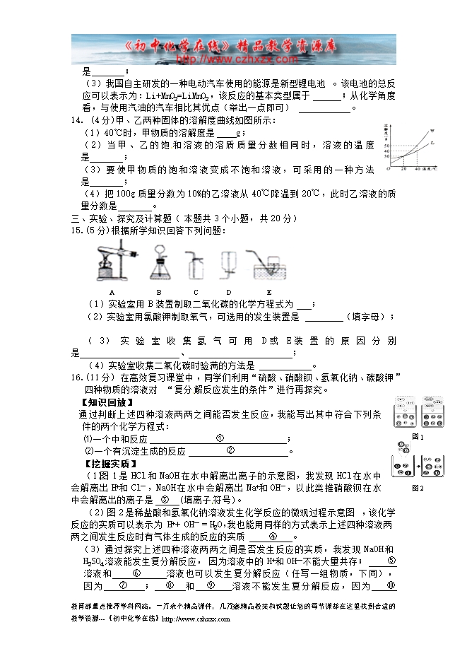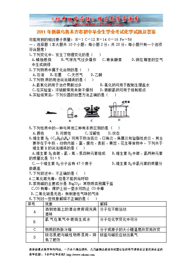 2011年新疆乌鲁木齐市初中毕业生学业考试化学试题及答案