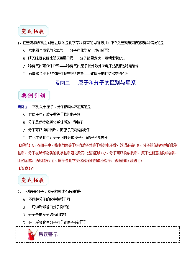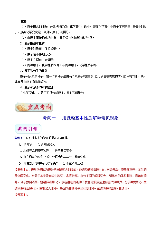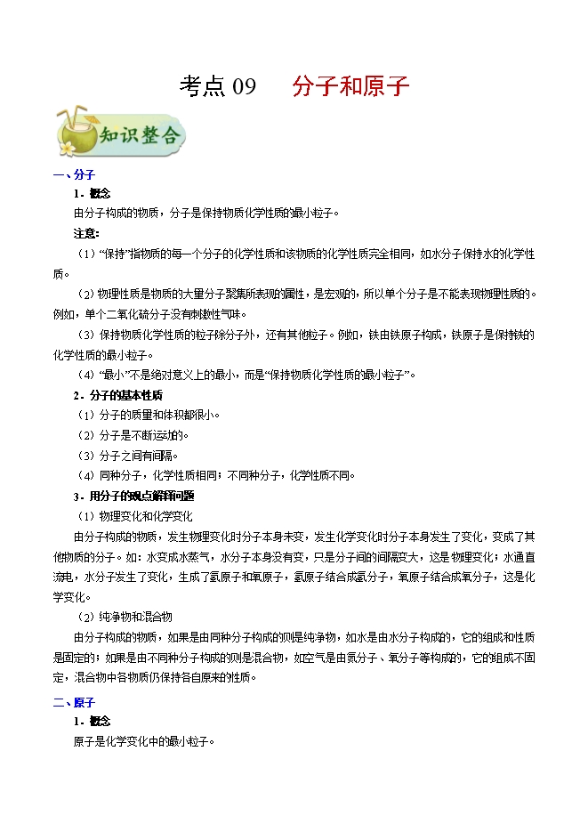 【内容简介】备战2019年中考化学考点一遍过考点09 分子和原子(word版含答案解析)