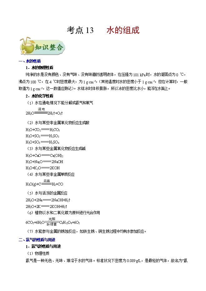 【内容简介】备战2019年中考化学考点一遍过考点13 水的组成(word版含答案解析)