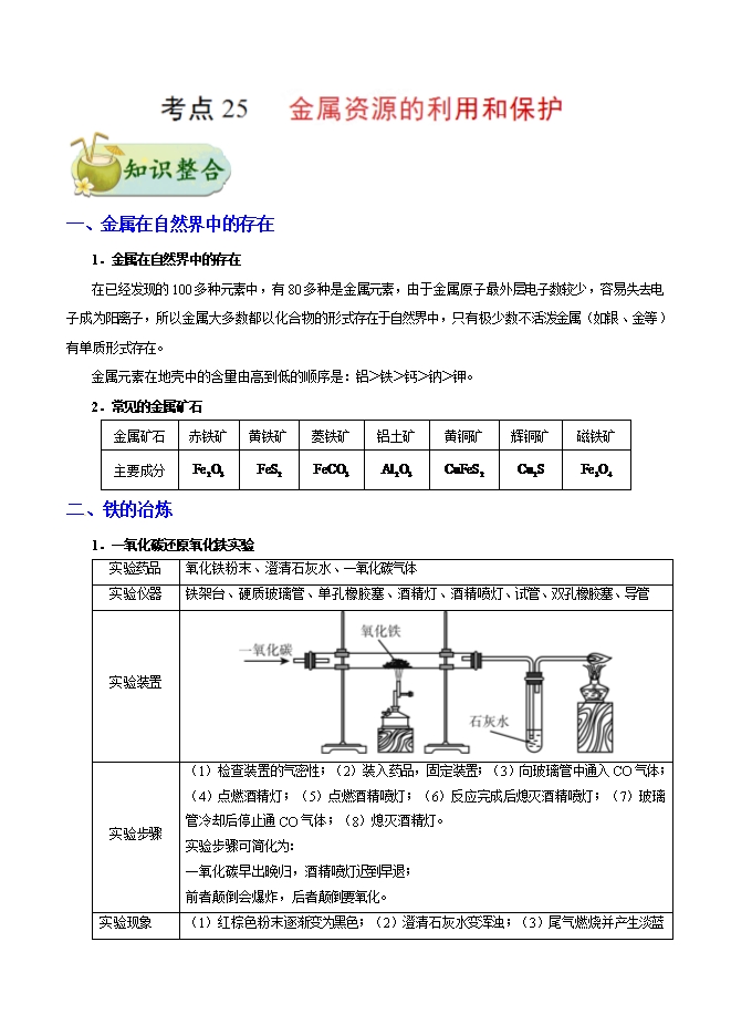 【内容简介】备战2019年中考化学考点一遍过考点25 金属资源的利用和保护(word版含答案解析)