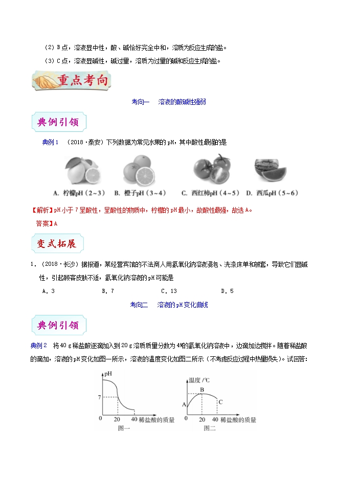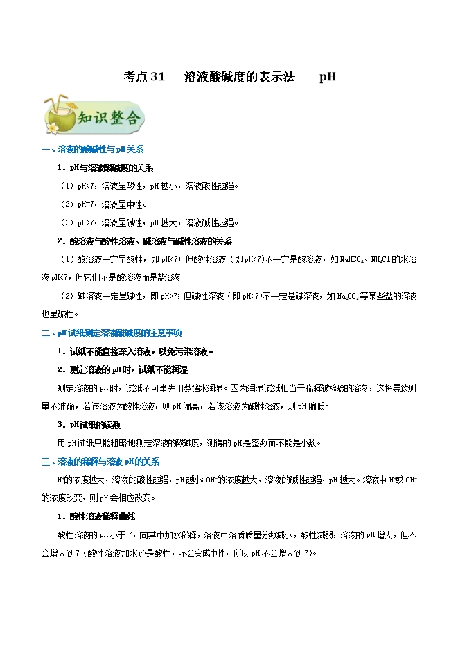 【内容简介】备战2019年中考化学考点一遍过考点31 溶液酸碱度的表示法——pH(word版含答案解析)