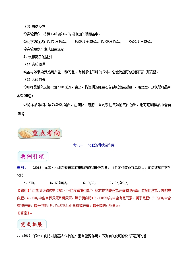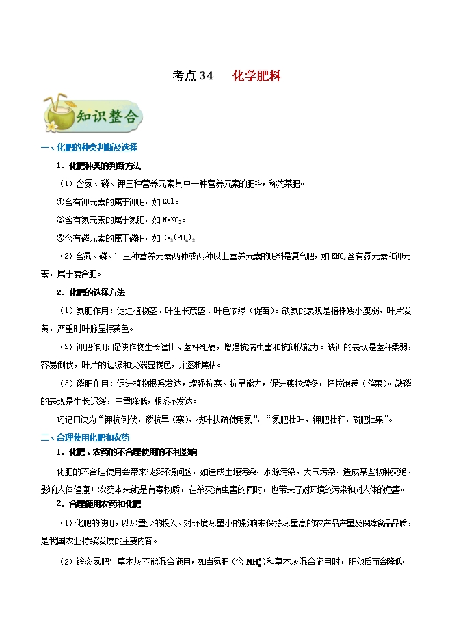 【内容简介】备战2019年中考化学考点一遍过考点34 化学肥料(word版含答案解析)