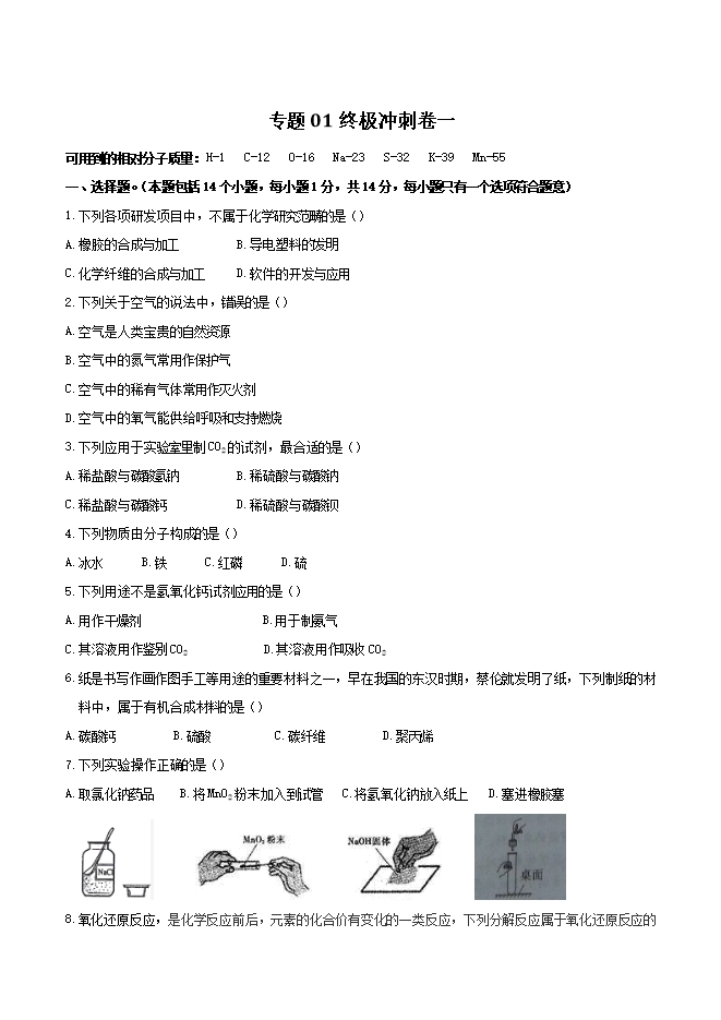 【内容简介】2019年中考化学终极冲刺模拟卷专题01 终极冲刺卷(一)(原卷版)