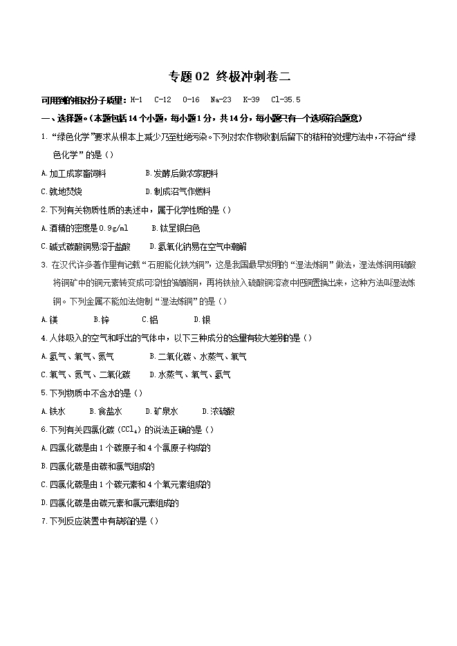 【内容简介】2019年中考化学终极冲刺模拟卷专题02 终极冲刺卷(二)(原卷版)