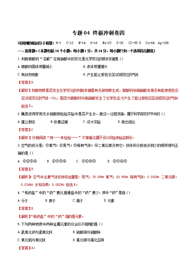 【内容简介】2019年中考化学终极冲刺模拟卷专题04 终极冲刺卷(四)(解析版)