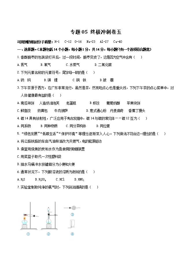 【内容简介】2019年中考化学终极冲刺模拟卷专题05 终极冲刺卷(五)(原卷版)