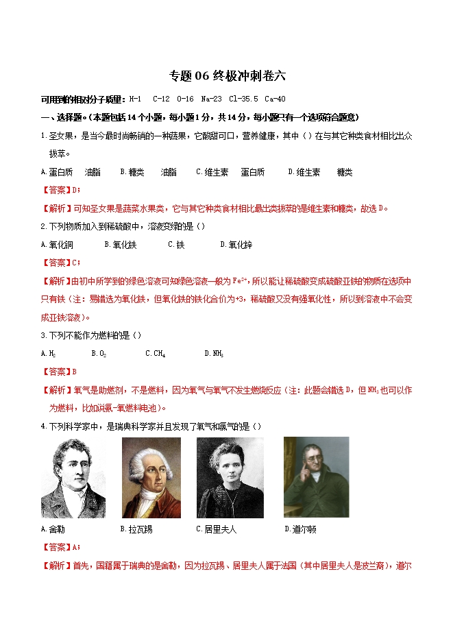 【内容简介】2019年中考化学终极冲刺模拟卷专题06 终极冲刺卷(六)(解析版)