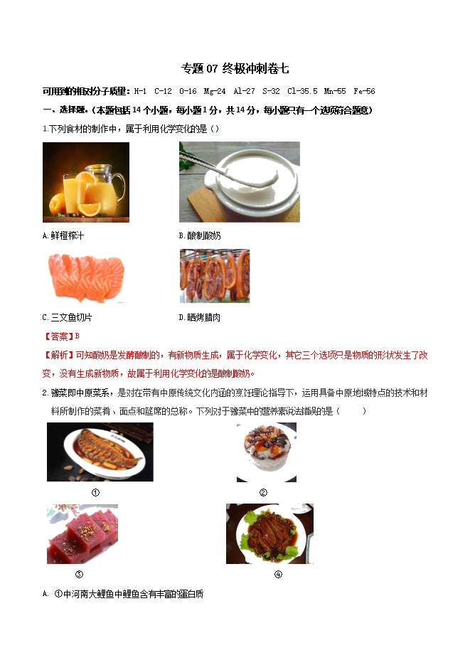 【内容简介】2019年中考化学终极冲刺模拟卷专题07 终极冲刺卷(七)(解析版)