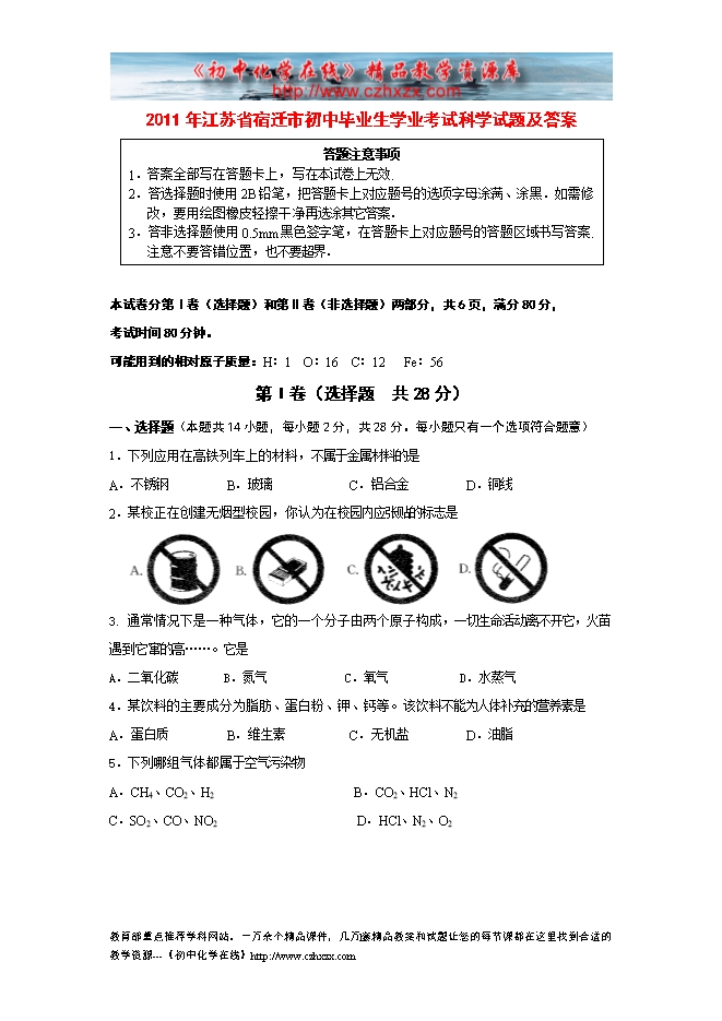 2011年江苏省宿迁市初中毕业生学业考试科学试题及答案