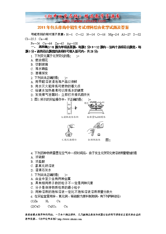 - 下一份试卷:2011年赤峰市初中毕业升学统一考试化学试题及答案