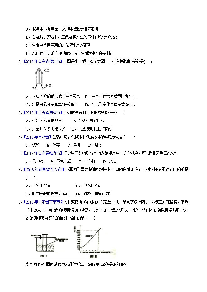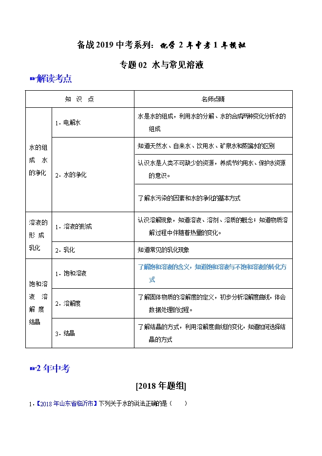 2019年备战中考化学精品系列2年中考1年模拟专题02 水与常见溶液(原卷版)