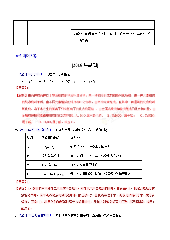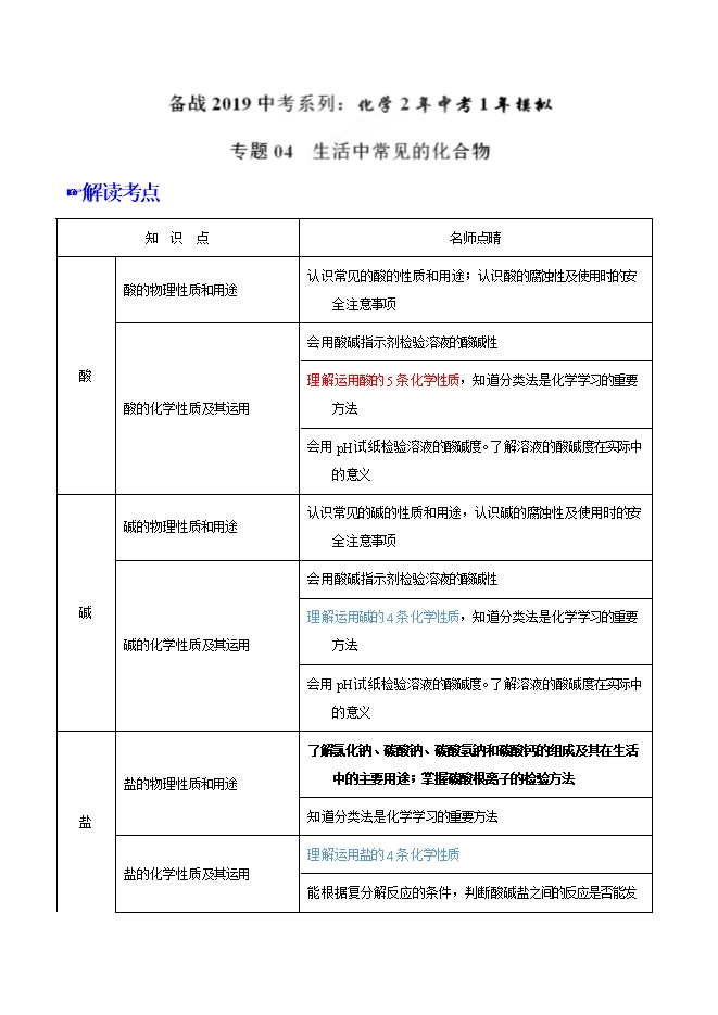 【内容简介】2019年备战中考化学精品系列2年中考1年模拟专题04 生活中常见的化合物(解析版)